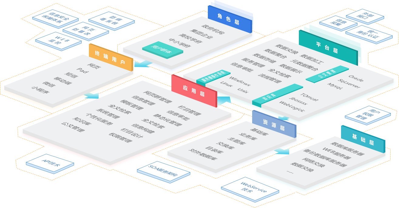 • 元数据管理、多维分类管理、复杂流程审批、网上办事、场景服务、资源目录服务、网站SAAS服务