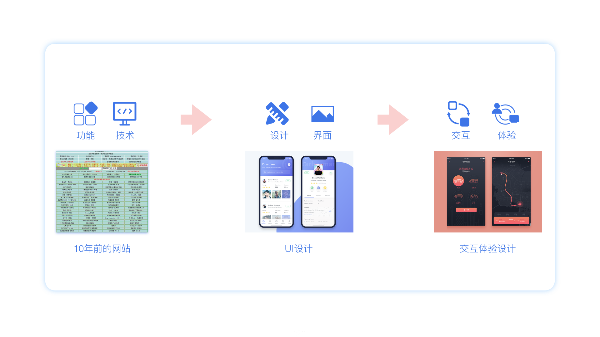举个例子:十年前,网站盛行,技术当道。那时候对于用户来说更关注的是功能,网站使用过程中体验的更多的是有没有这个功能,能不能使用等。当网站开展到一定程度后,人们的焦点从功能转移到外观,这时候出现了大量的UI设计师。到最后人们的焦点又从外观转移到体验的时候,这时才真正的出现了所谓的交互设计。