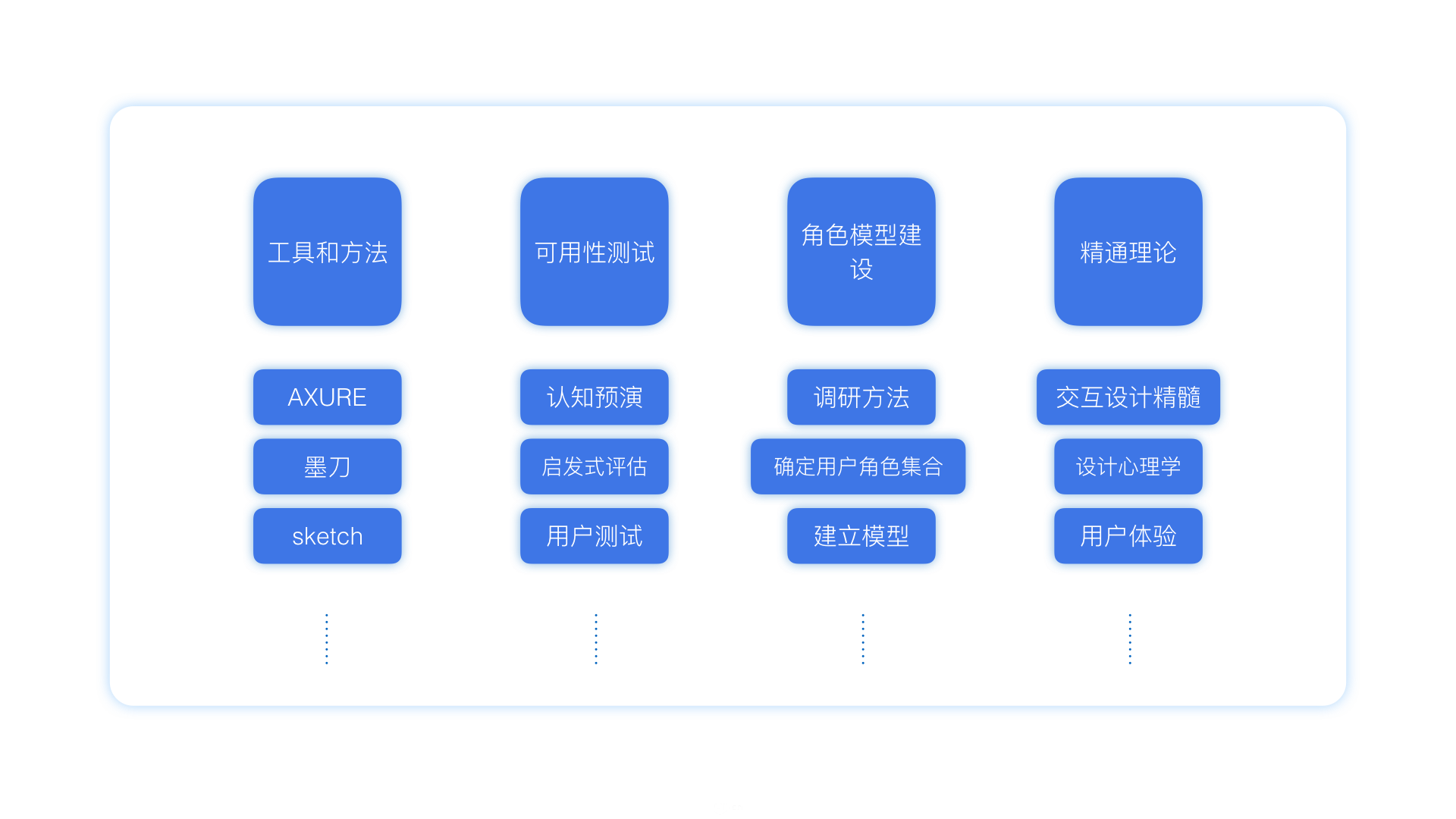 我觉得交互设计师应该需要熟练掌握交互工具和方法(Axure、可用性测试、角色模型建设,或者精通各种理论),我们需要从4个方面不断的提升自己。