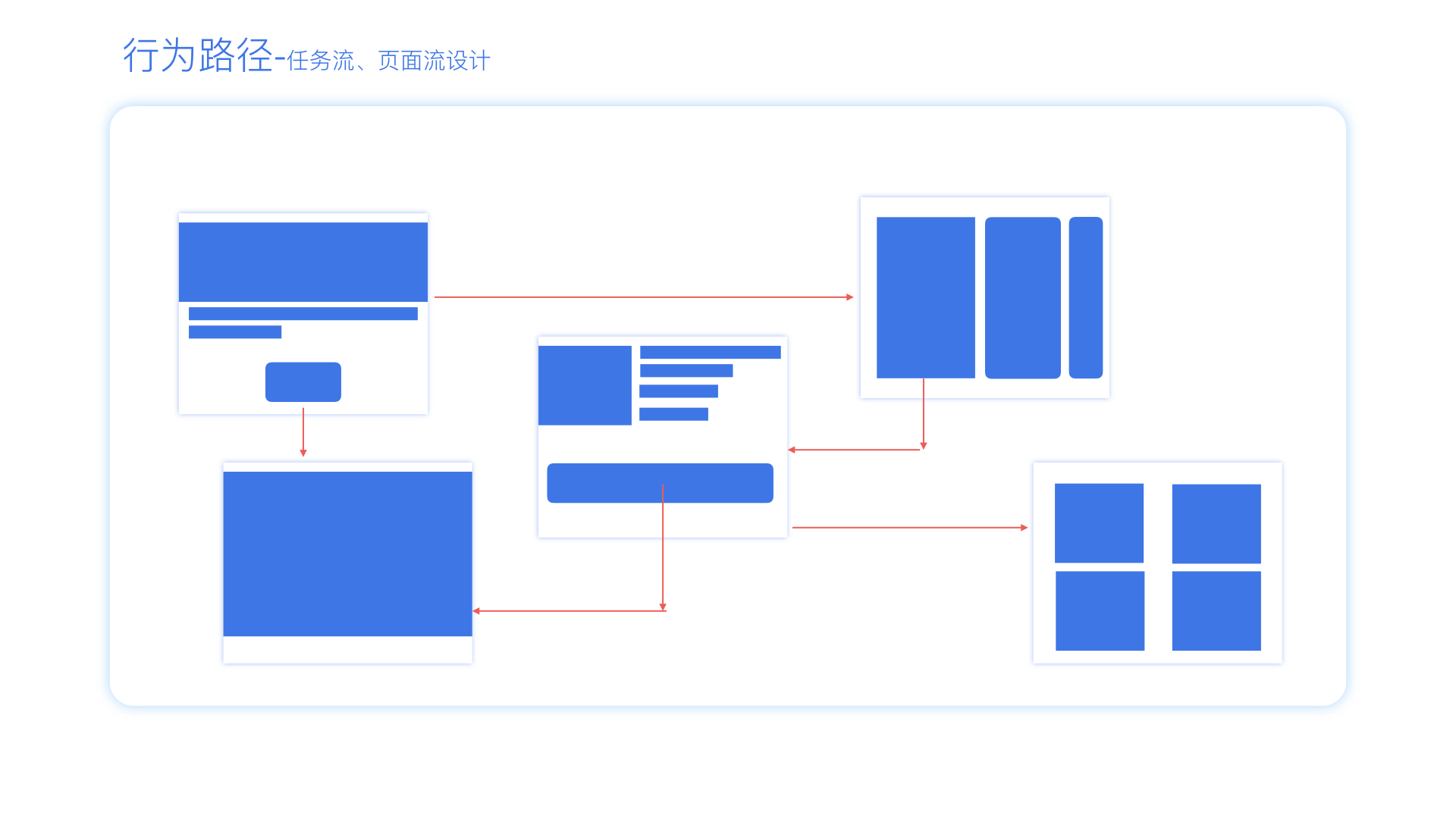 1.行为路径-通常称之为页面流程图(Page Flow),主要是关注任务流和页面流的设计,让用户在使用过程中,页面跳转流畅,用户使用无障碍,并且提高了让用户达到产品目标的效率。在这个步骤中,页面通常不用很好看,只要讲清楚任务流,业务流即可。主要就是讲清楚产品主要功能流程就行。